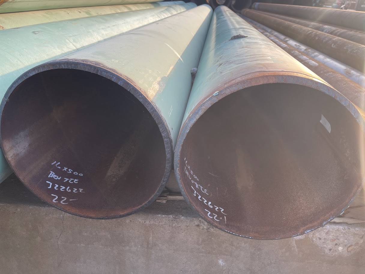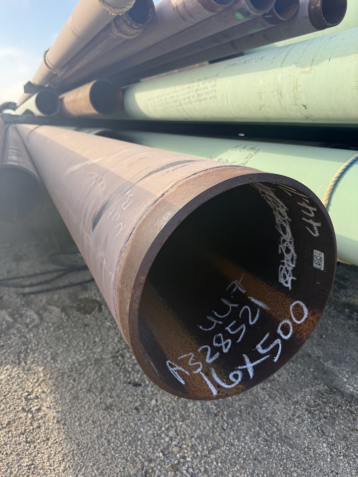 16 inch OD × .500 wall carbon steel pipe for sale, commonly supplied for structural, piling, foundation, casing, culverts, pipeline, water well, irrigation, fabrication, fencing, bollards, oilfield, and general construction applications.