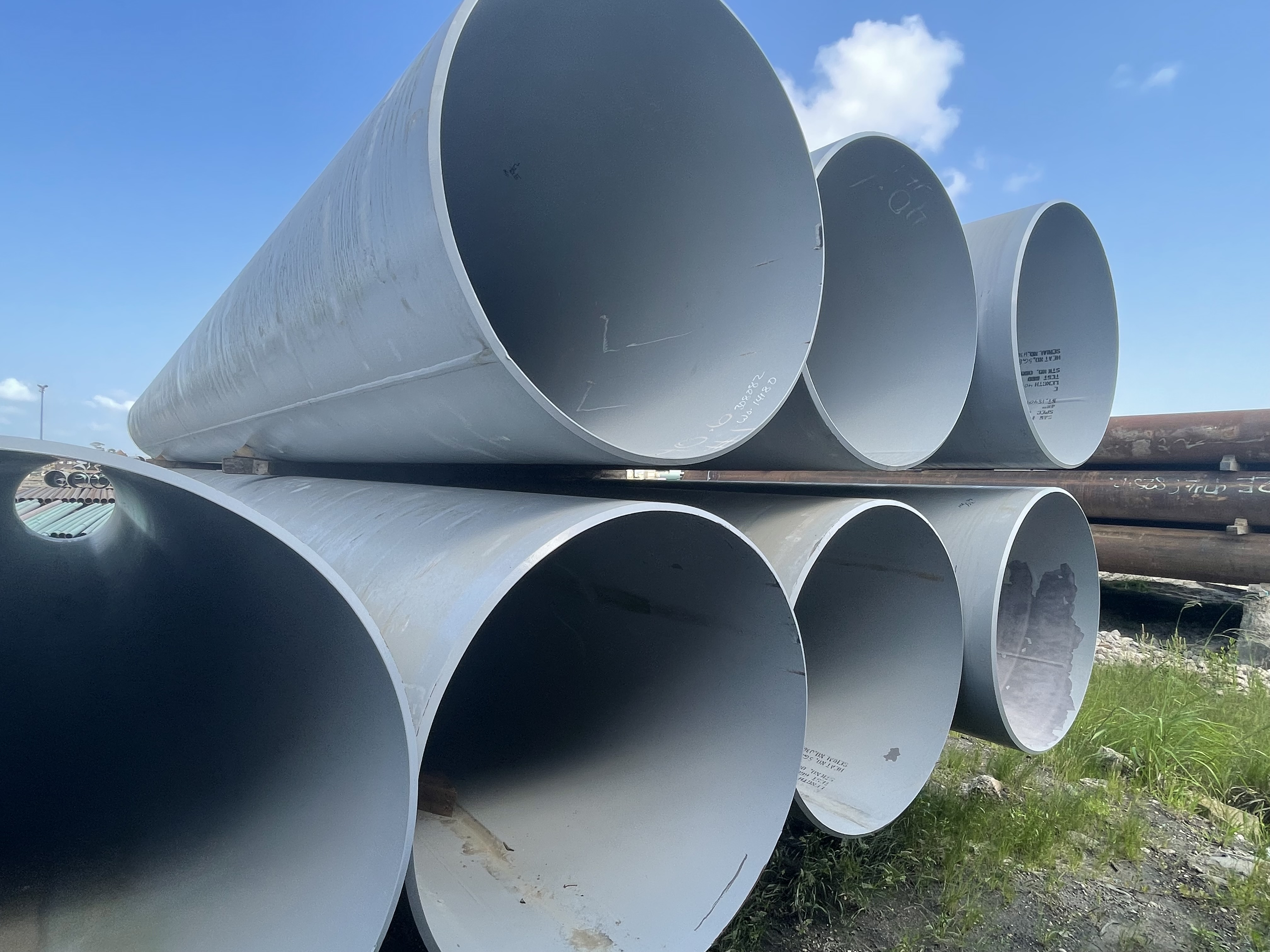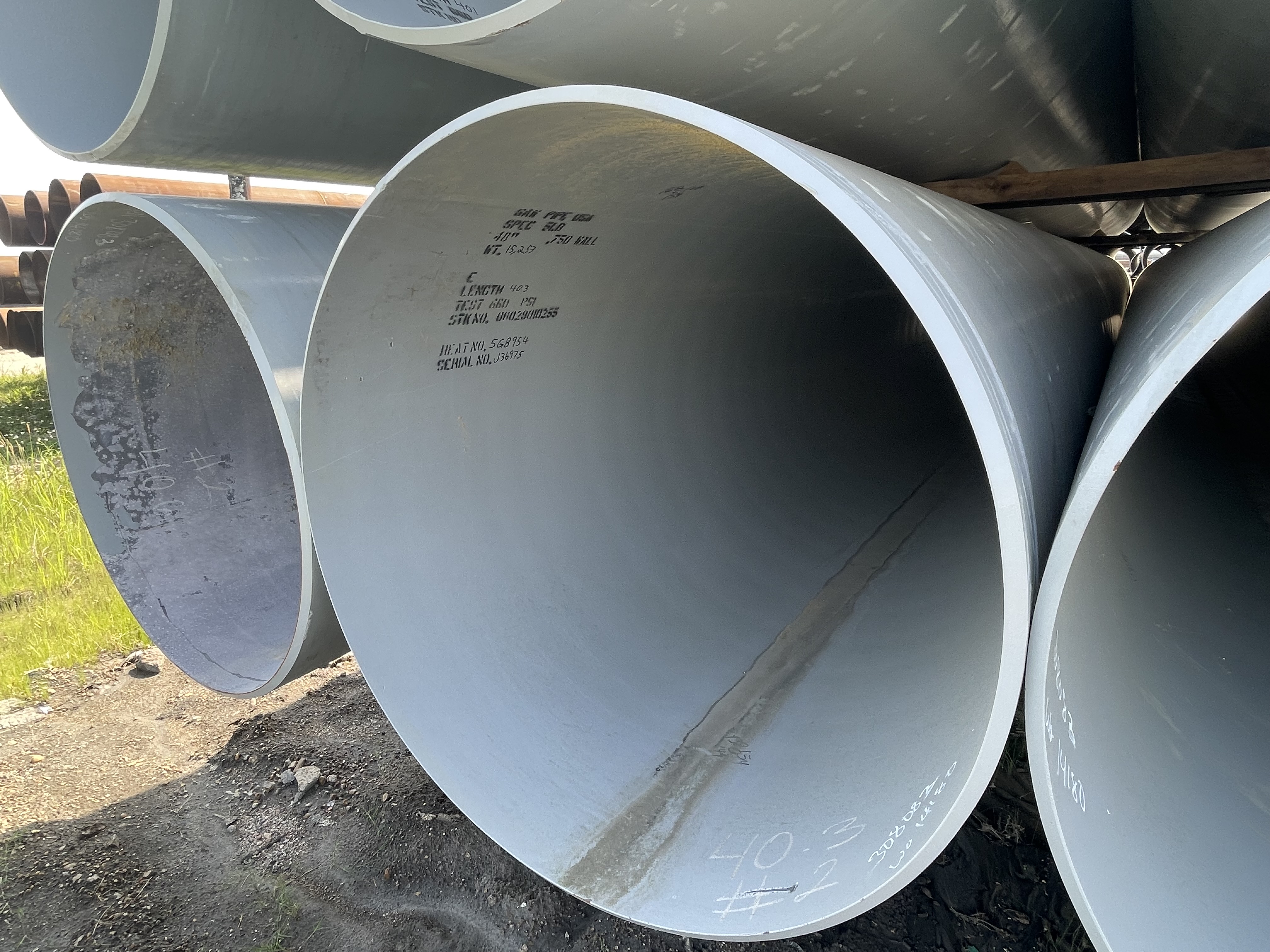 48 inch OD × .750 wall carbon steel pipe for sale, commonly supplied for structural, piling, foundation, casing, culverts, pipeline, water well, irrigation, fabrication, fencing, bollards, oilfield, and general construction applications.